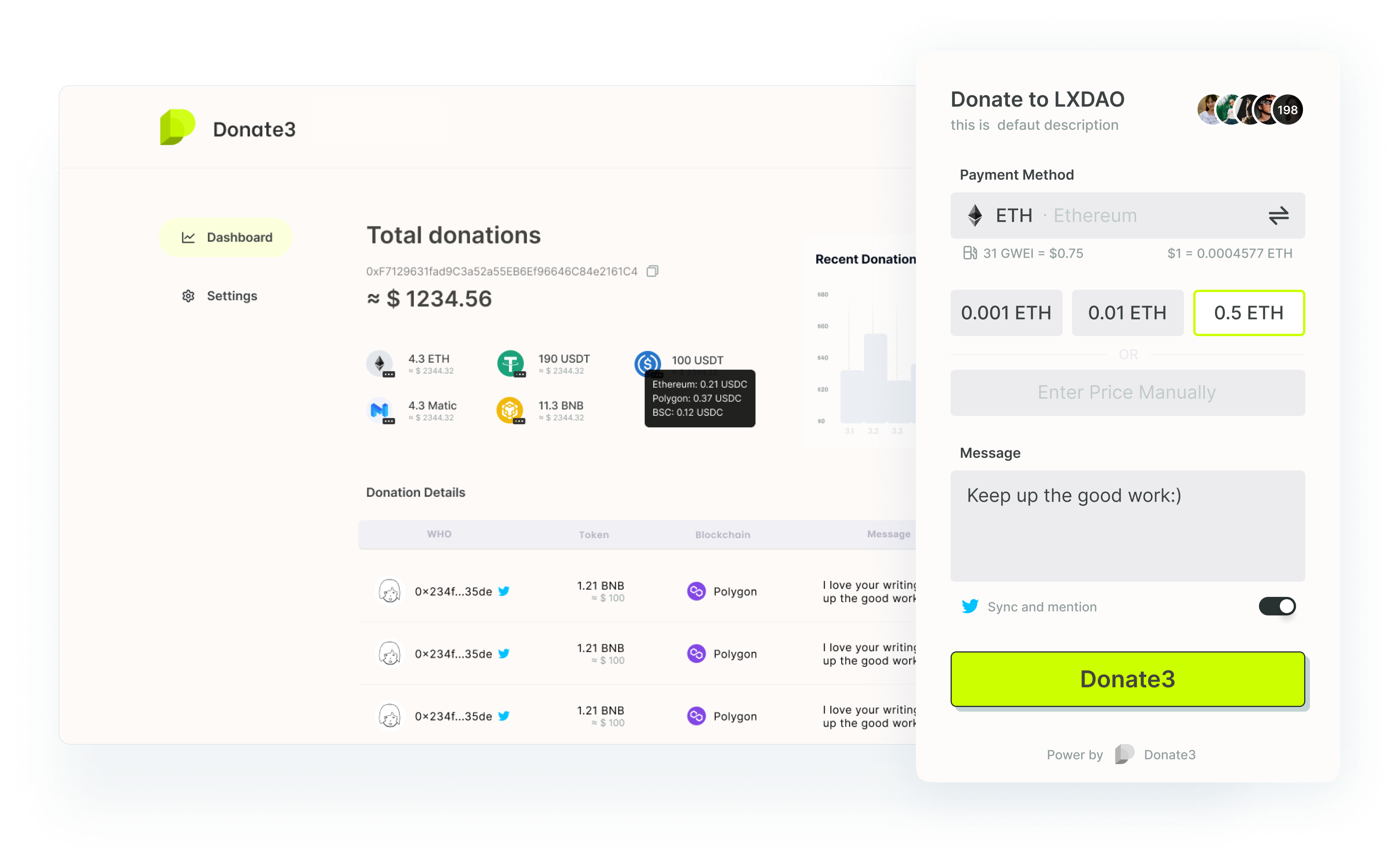 Donate3 utilizes Infura's RPC endpoints to access mainstream EVM chains, supporting multiple token donations to enrich your funding sources.